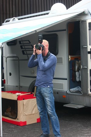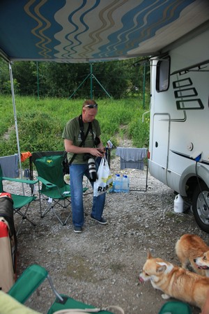 Приехали мы туда “на шару” в пятницу днем, место для автодома заранее не бронировали, даже не узнавали, есть ли на территории выставочного комплекса специально оборудованная кемперная стоянка. Оказалось – есть. Въезд свободный, выбор места по принципу “кто первый приехал”, стоимость парковки с подключением к электросети – 20 евро в сутки (впрочем, деньги собирать так никто и не пришел, простояли 2 дня бесплатно). Нам досталось место примерно в 20 метрах от бокового входа в выставочный павильон. Вернее, два места – одно для кемпера, на втором мы расставили собачьи боксы, грумировочный стол и кресла. Обнесли все это хозяйство переносным заборчиком, натянули тент, и получилась вполне сносная “летняя веранда”. Там отдыхали и спасались от удушающей жары мы сами, и туда же периодически наведывались посидеть в теньке и скоротать время за чашкой кофе водители наших российских коллег (и я их вполне понимаю, приехать к началу рингов и просидеть весь день в микроавтобусе на тридцатиградусной жаре – удовольствие ниже среднего).